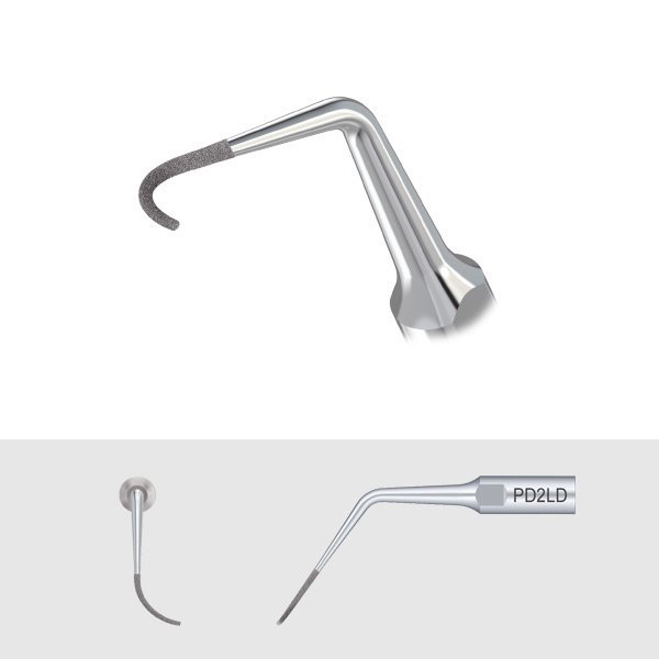 • Насадка PD2LD с алмазным покрытием (40 мкм), изогнутая под углом в левую сторону, для удаления зубных отложений в области шейки зуба и коронарной трети корня зуба.