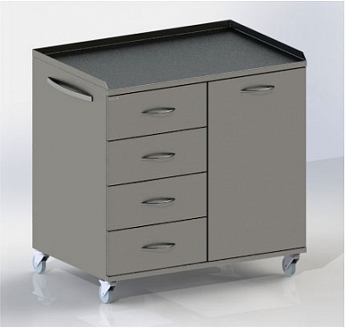 Столик изготовлен из нержавеющей стали. Имеет 4 выдвигающиеся ящика, дверку, выдвижную полку, колесные опоры диаметром 75 мм.  Столешница имеет ограждения по трем сторонам.